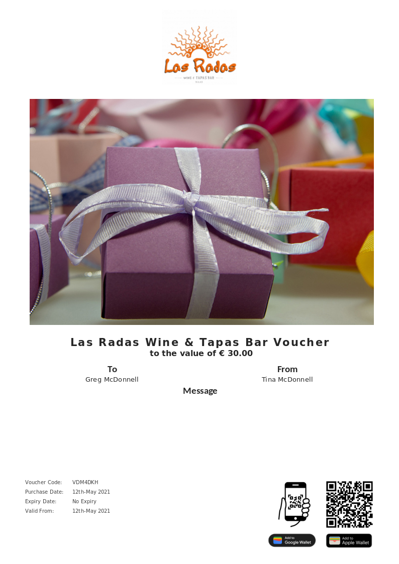Las Radas Wine & Tapas Bar allows you to purchase instantly printable gift vouchers, special offers and tickets using the Voucher Connect platform.